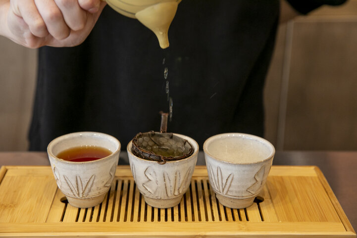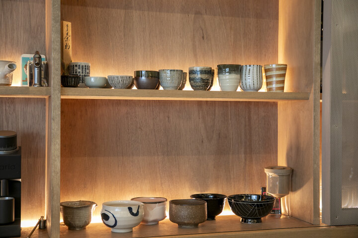 カウンターの端には茶釜が据えられ、湯は常に70度に保たれています。その存在はまるでこの店のリズムをつくっているかのよう。あわただしさとは無縁のテンポでお茶が淹れられ、会話も自然と落ち着いたものに。