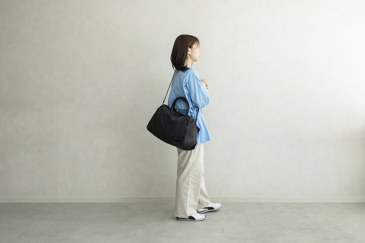 まずご紹介する「ナイロン2WAYバッグ」は、ショルダーとして肩掛けできるだけでなく、ショルダーストラップを左右に引っ張ると、なんとリュックに変身してしまうバッグ。一瞬でチェンジできるので、旅先にはもちろん、荷物が増えるデイリーシーンでも活躍してくれます。 表地には肌触りの良い高密度の撥水タフタを、裏貼りには厚手のニットを採用。軽さはそのままに、適度なハリ感も楽しめ、オフィスにも連れて行けそうです。
