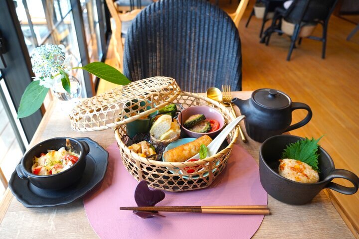 管理栄養士が監修する「桜山オリジナル籠べんとう」は、旬の有機野菜が彩り豊かに並んだ心身が喜ぶ一品。食後には、北海道産の濃厚なソフトクリームを添えた甘味が、心地よい満足感を与えてくれます。テラスから望む庭には月桂樹やハーブがのびのびと育ち、吹き抜ける風が季節の香りを運びます。古き良きものを大切にしながら、現代の感性を重ね合わせた空間に、新しい感性が刺激されそうです。