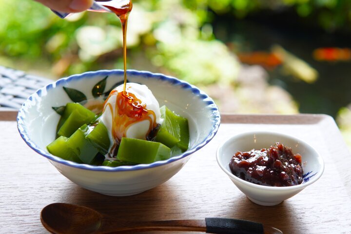 海をテーマにした10色のクリームソーダや、ゼリーと白玉を盛り合わせ透明感あふれる「海のしずく」などの涼やかなメニューが魅力です。二間続きの和室からは石灯籠のあるお庭が望め、縁側には地域猫が姿を見せることも。万葉集の時代から愛されてきた千鳥の意匠に囲まれながら、畳の上で足を伸ばしてくつろぐひとときが過ごせます。