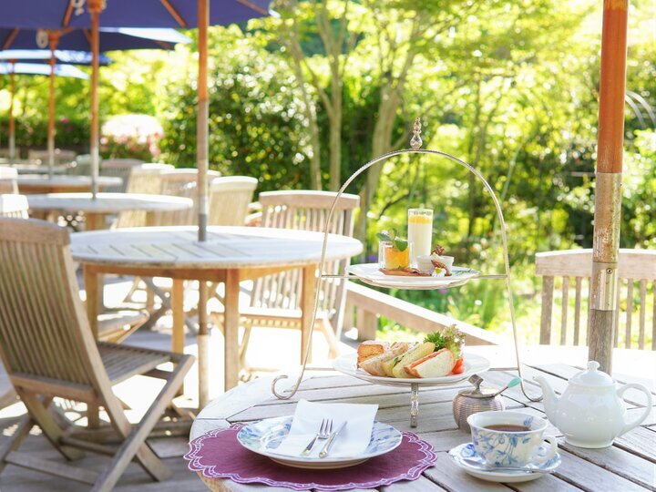 窓の外には、建物のクラシカルな雰囲気に調和するイングリッシュガーデンが広がります。テラス席では、洋館の重厚なシルエットと四季折々の草花が一体となった、絵画のような風景に浸ることができます。こうした空気の中で楽しむ「アフタヌーンティー」は格別です。