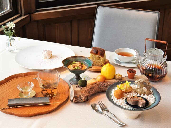 通常はフレンチレストランとして、特別な日に訪れたいお店ですが、月に一度「森のアフタヌーンティー」が開催されます。繊細な料理やスイーツがまるでコース料理のように一皿ずつタイミングよくテーブルへ運ばれてきます。フレンチの華やかさとともに、木の幹にスイーツがかわいく並び、北欧紅茶といただくひと時は日常を遠ざける至福のひととき。建築が持つ圧倒的な存在感に身を委ね、往時の華やかなサロン文化を肌で感じることができます。