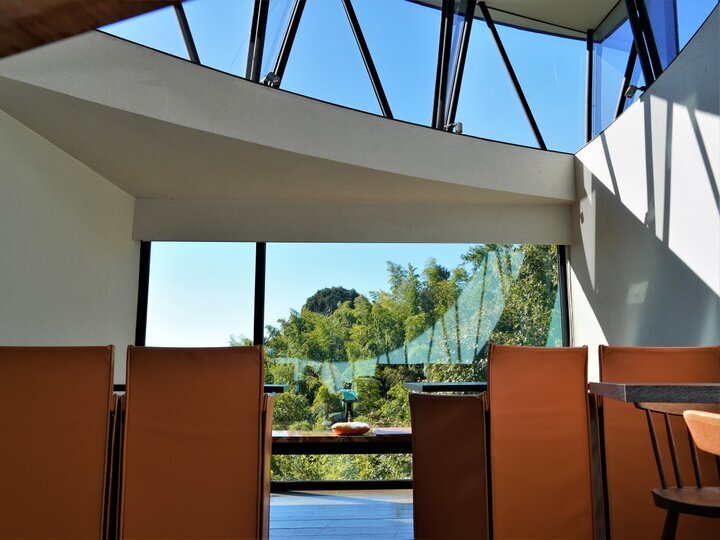 鎌倉山の勾配を活かした斜面に建つ「ハウス オブ フレーバーズ」。木の葉のようなお店にしたいというオーナーのホルトハウス房子さんのリクエスト通り、鎌倉山に生い茂る木々の葉っぱをイメージしたという建物です。階段も窓際の大理石のベンチの下にも支える柱は一本もないすっきりとした設計で、天井を見あげると木の葉の形になっています。