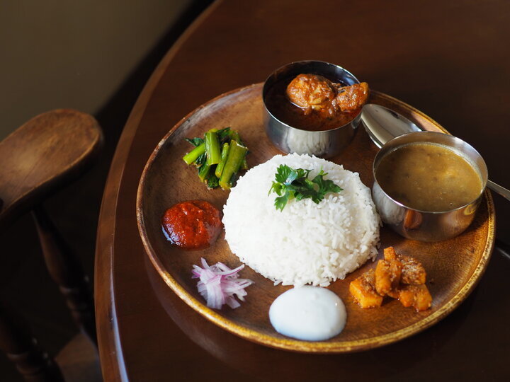ネパールの定食「ダルバート」。お皿の上で混ぜ合わせながらいただくと何通りもの味わいを楽しめる