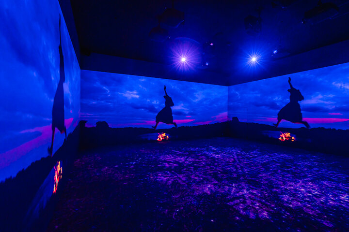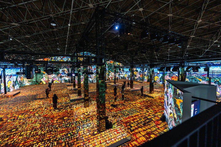 シアターは、約6000㎡の巨大倉庫に、昭和建築技術の象徴であるトラス構造が描き出す、約1800㎡のダイナミックな空間。合計75台のプロジェクターと27台のスピーカーから放たれる映像と音楽が倉庫全体に響き渡ります。 〈メインステージ〉〈2Fエリア〉〈ミラールーム〉とあるので、2Fエリアへ上がり俯瞰してみたり、ミラールームで幻想的な世界に浸ったり。見る場所によって感じ方も楽しみ方も広がるのが最大の魅力です。