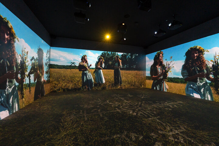 (リトアニアの夏至祭の様子)ハーブや花の冠を頭に飾り自然への感謝を歌う女性たち