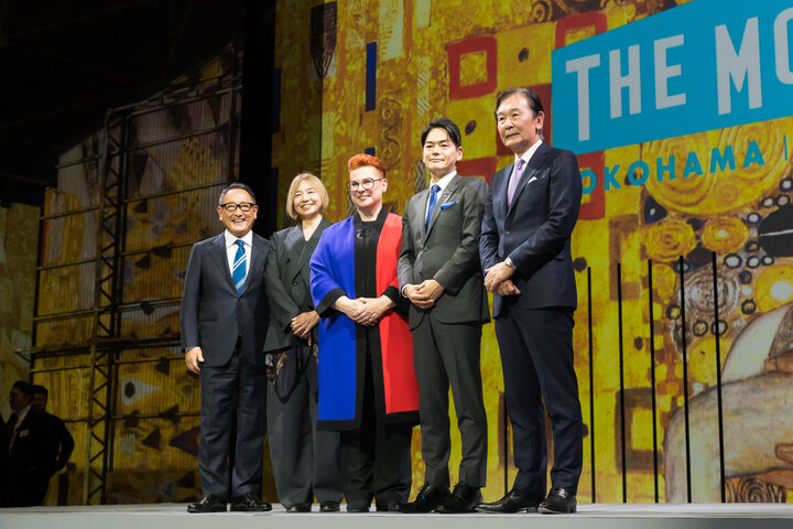 《先行披露レセプションの様子》左から、豊田章男さん(トヨタグループ)、山口智子さん(「LISTEN.」プロデューサー)、 シグリッド・ベルカさん(駐日オーストラリア大使)、山中竹春さん(横浜市長)、都倉俊一さん(作曲家、文化庁長官)