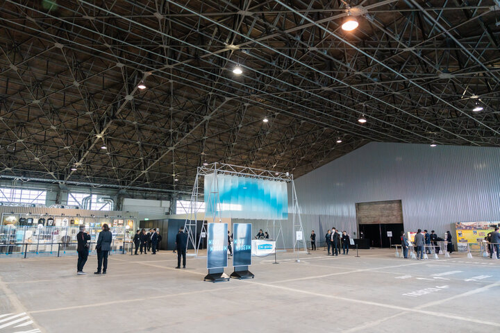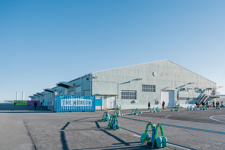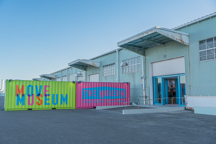 メイン会場となるのは、行き交う船、ベイエリアのビル群を望む場所に建つ、戦後の復興期から日本の物流を支えてきた「山下ふ頭4上屋」。 「THE MOVEUM」の文字が描かれた青いコンテナや、入場ゲートのカラフルなコンテナアートがロケーションに映えています。