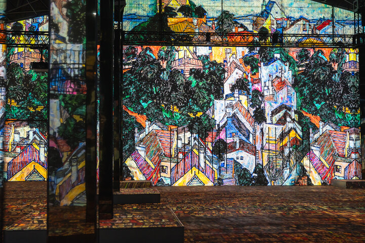 シーレの作品には、田園風景や街並みを描いた風景画も多くあります。家々の佇まいや洗濯物が、リヒャルト・シュトラウスの音楽をバックにリアルに映し出されています。 音楽との一体感に包まれると、まるで街の中に入り込んだかのよう。「観る」「聴く」を超えた心に触れる没入体験は、記憶に残るひとときになることでしょう。