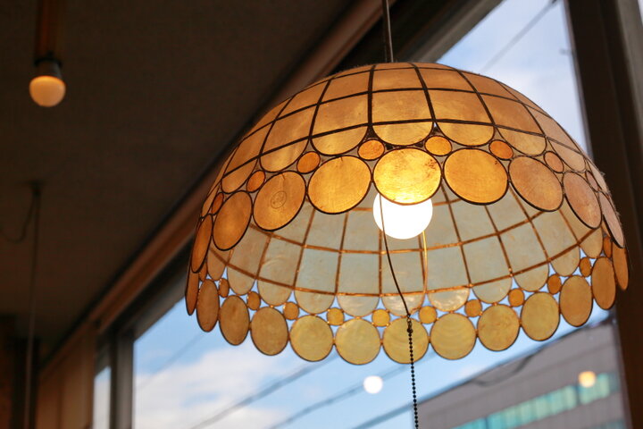 店内に入ると、レザー調のソファシートや広めのテーブルなど、他店舗よりもゆったりと配された席となっています。道路側は一面窓になっていて明るい店内ですが、スポット電球やレトロなシェルシェードランプの温かい光がアクセントになった、レトロ&ゴージャスな空間です。