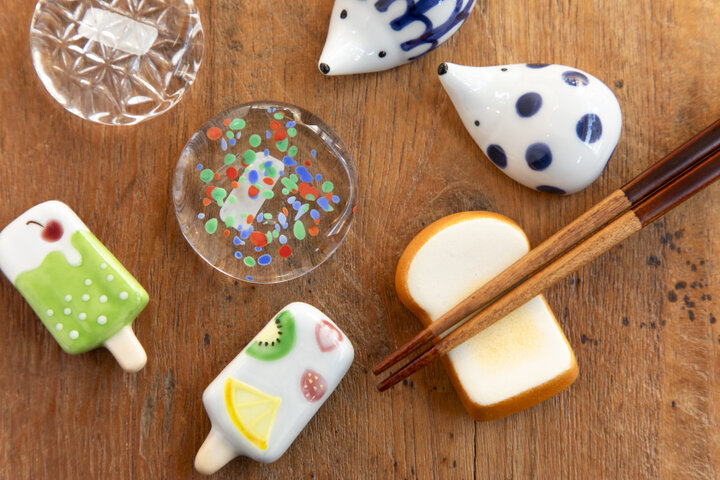 季節感を気軽に演出できる箸置きも人気です。 クリアな「ガラスの丸箸置」(825円)は、切子風のカットが上品で、シンプルで使い易い一品。カラフルでポップな「氷菓箸置」(5個1組4400円)は、夏にぴったりの箸置き。ギフトにも喜ばれそう。マットな質感や焼き色が絶妙な「食パンの箸置き(美濃焼)」(550円)は食パンの風合いそのもの。
