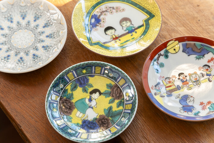 次に、明治を代表する回遊式林泉庭園「清澄庭園」のすぐそばにある和食器と小物の専門店「青葉堂」へ。店内には、九谷焼、有田焼、美濃焼などさまざまな産地のごはん茶碗やお皿、箸置きなどがずらりと並びます。 ちびまる子ちゃんやドラえもん、ハイジ、スヌーピーなどおなじみのキャラクターが描かれている「九谷アート小皿」は、九谷焼ならではの鮮やかな色彩と紋様を活かしながら、うまくキャラクターと融合させた、ユニークでかわいい大人気のシリーズ。