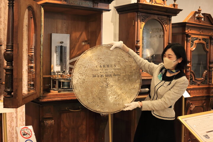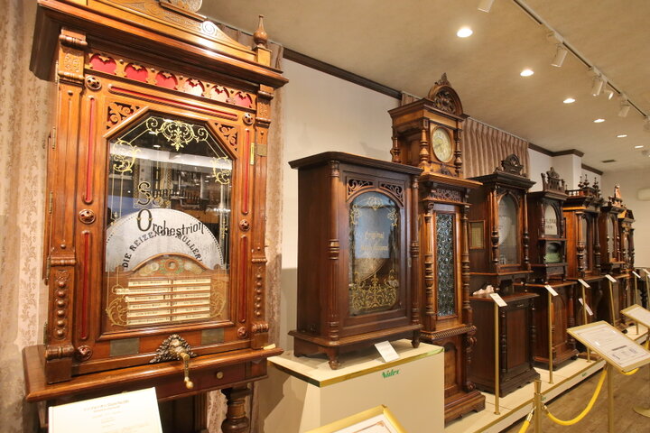 2Fは世界の貴重なオルゴールがずらりと並ぶ音楽ホールのような空間になっています。スイスで200年以上前に誕生したといわれるオルゴール。その後ディスクを変えていろいろな曲を奏でることができるディスクオルゴールが登場し、ドイツを中心に発展します。