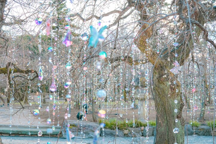 北野天満宮のために新しく制作されたクリスタルは、パーツすべてが手作りとのこと。ひとつひとつをつなぎ合わせ、デザインや並び順にもこだわりが詰まった作品となっています。風が吹くとゆらゆらと、空の色を受けて輝きの表情が移り変わっていくのも魅力です。配置も梅に影響が出ないよう丁寧に配慮されており、優しい時の流れを感じられる空間となっています。