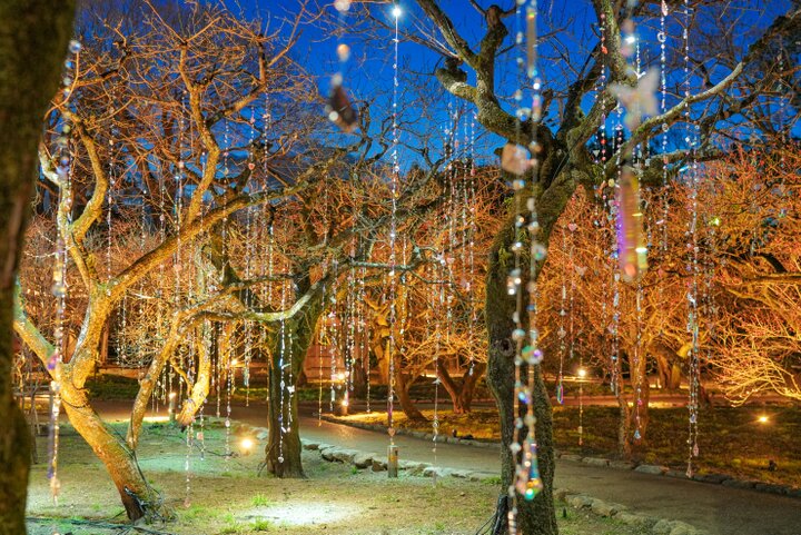静かにキラキラと輝く梅苑もまた、夜だけの特別な景観となり、やわらかで幻想的な空間は思わず息をのむ美しさです。夜に浮かぶ梅の表情をじっくりと眺めながら、小路を散策するのもおすすめですよ。