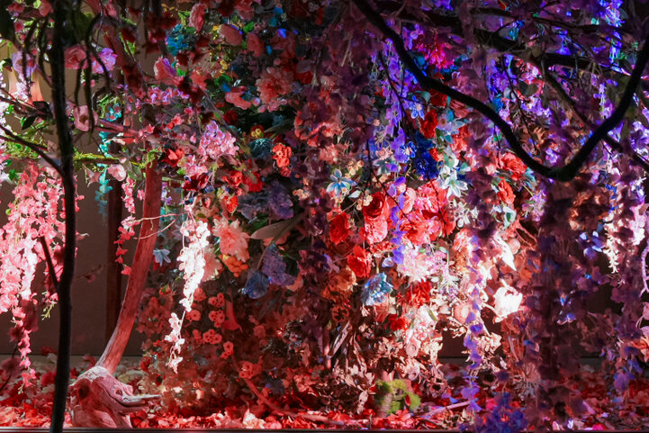 茶室を舞台にした《残照》は、咲き誇る花と、落ちてゆく花という対照的な表情をそっと同じ空間に共存させたインスタレーションです。使われている花々はすべて手作りの造花で、華やかに咲く姿だけでなく、あえて枯れた状態の花も組み合わせることで、いのちの循環に潜む静かな美しさが表現されています。