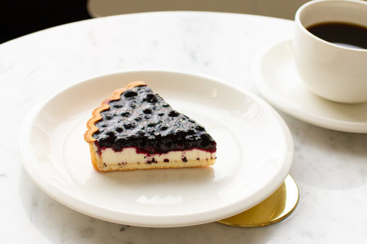 食後のデザートやティータイムには、フィンランドの家庭で親しまれている「ビルベリータルト」が人気です。ビルベリーはブルーベリーの野生種で、ブルーベリーより小粒で酸味がやや強く、野性味あふれる濃厚な味わいが特徴。タルトに使用しているのは、フィンランド大使館おすすめの、スウェーデン産のオーガニックビルベリー。 甘酸っぱいビルベリーソースに、爽やかなレアチーズ、しっとりとしたタルト生地の三層が織りなす、バランスのとれた深みのある味わいです。レアチーズはクリームチーズとサワークリームを合わせることで甘さ控えめに仕上げており、ベリーそのものの風味を最大限に引き立てています。