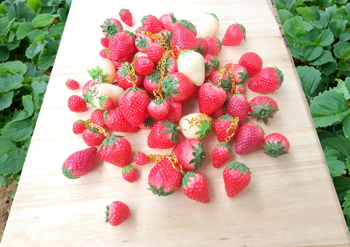 ●秘密の苺MICO E 食べられない苺シリーズ 全国の色々な苺の品種をリアルに再現しバッグチェーンに仕立てました。今年は「食べられないミルキーベリー」と「食べられない信大BS8-9」が新登場し11品種に増えました。