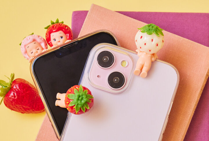 ●秘密の苺MICO E(2号館1F) ぶら下がり苺キューピー ちょこんと顔を出す姿が可愛らしい、ぶら下がり苺キューピーちゃん。スマホなど好きなところに貼って、日常のささやかな癒しに。