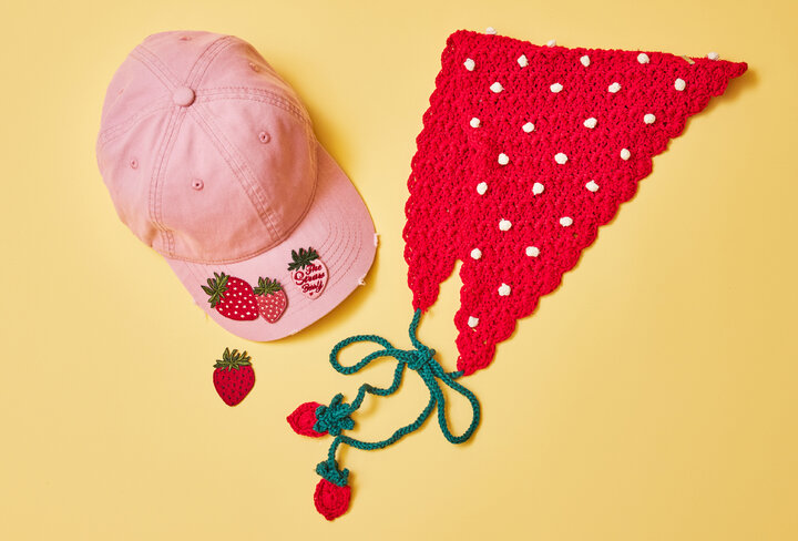 ●OVERRIDE(2号館1F) いちごモチーフのワッペン各種/いちごちゃんバブーシュカ 今年も限定アイテムが登場。トレンドニットスカーフのいちご柄バブーシュカは、綿素材なのでさらっとした風合いで、顔周りに巻いたり付け襟にしてもGOOD。キャップなどにつけてアレンジを楽しめる苺ワッペンも用意しています。