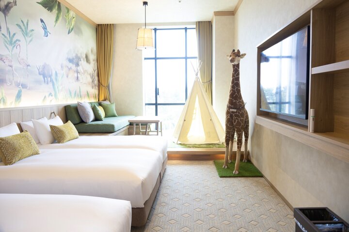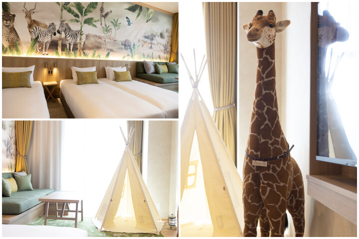 キリンが迎えてくれるこちらの客室は、その名も「サファリ」。ベッドの上の壁面にはアフリカの野生動物たちが描かれ、旅心が刺激されます。 奥の小上がりスペースはサバンナのオアシスをイメージ。小さなテントが張られており、大自然の中でグランピングしている気分が楽しめますよ。部屋によっては天井に頭がつくほどの大きいキリンもいるのだそう。どんな子に会えるかお楽しみに。