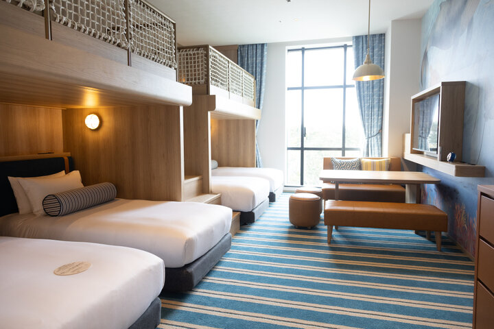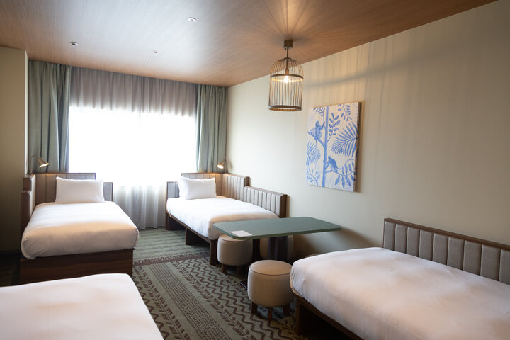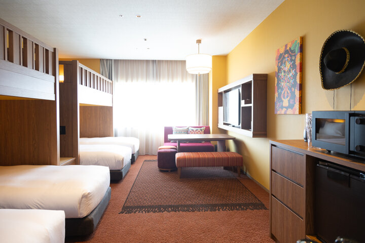 マリンストライプのカーペットと波模様のカーテンが印象的な「オーシャン」は、クルーズ船で海を旅している感覚を味わえる客室。船のキャビンを模した2段ベッドがあり、6名までステイ可能です。 壁にはジンベイザメやザトウクジラ、アオウミガメ、カクレクマノミなど海の生きものが描かれ、大海原に包まれているかのよう。大きなテーブルを囲んでおしゃべりやごはんも楽しめます。洗面シンクやドライヤーが2つあり、洗い場付きバスルームのほかにシャワーブースも設置。グループや家族で訪れても、余裕をもって朝の支度ができます。