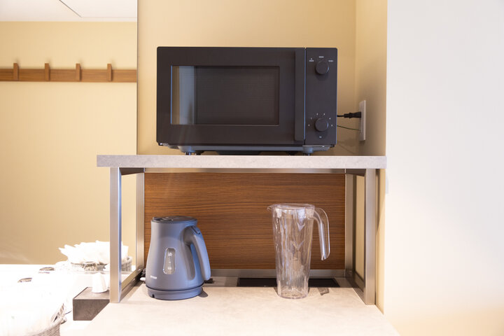全室に電子レンジとポット、テーブルを設置しているので、部屋で簡単な食事が楽しめるのもうれしいポイント。食器類のほか、ドリップコーヒーや紅茶・緑茶のティーバッグも用意しています。