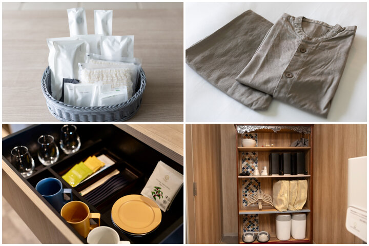 左上:各室のアメニティ 右上:セパレートの室内着 左下:人数分のカップやグラスを準備 右下:レンタル品が置かれた共用スペース
