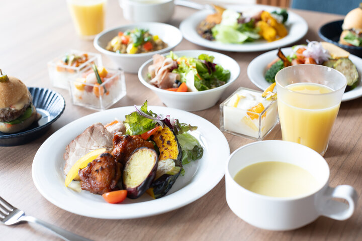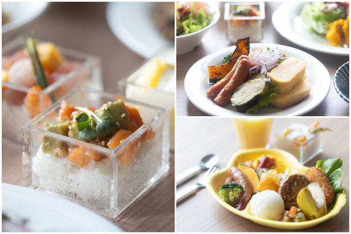 料理は和洋の定番メニューをはじめ、中華・点心、カレー、エスニック、ハワイアンなど約80種類を用意。肉や魚のメイン料理から、旬の生野菜・グリル野菜、シリアル、ヨーグルト、フルーツ、そしてデザートまで、ラインナップ豊富に取りそろえられています。 クリアケースに取り分けられたアボカド・サーモン丼やバラちらしは、見た目もきれいなうえ、ちょこっとずつ味わえるサイズ感がうれしい逸品。気になる料理が盛りだくさんで、朝から贅沢な時間が過ごせます。