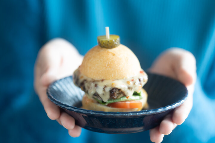 ライブキッチンでは、手のひらサイズの本格的なミニバーガーを提供。チーズをのせたパテを目の前で焼いてもらい、できたてを味わうことができます。ホテル自慢のメニューをぜひ楽しんでくださいね。