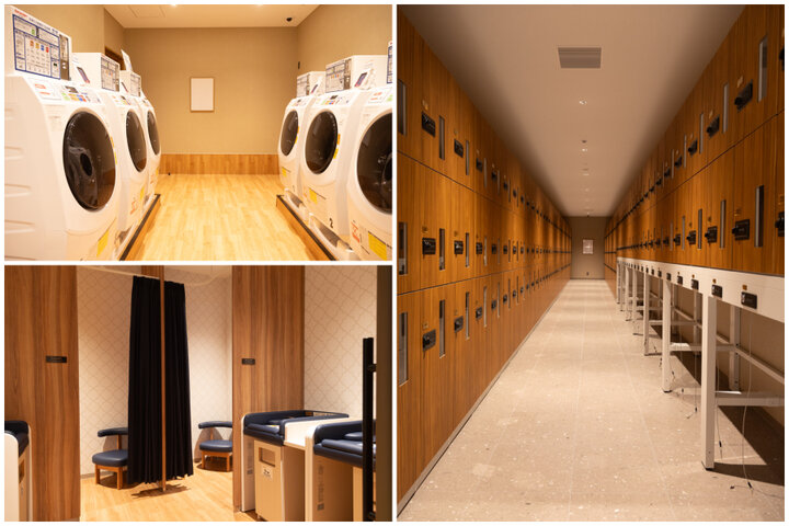 左上:10台のコインランドリー 左下:ベビールーム 右:225個のロッカー