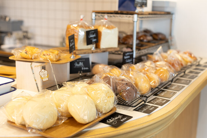 店のカウンターに焼きたてのパンが並び出すのは10時から。看板商品の生食パンをはじめ、生食メロンパン、塩パン、クロワッサン、惣菜パンなどラインナップも充実しています。