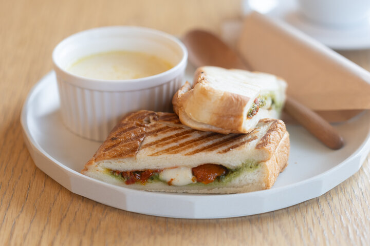 10時からはフードメニューの提供も開始。パンを買ってイートインもいいですが、せっかく訪れるならぜひアツアツのホットサンドを味わってみましょう。定番のハム&チーズ、ドライトマトとモッツァレラが入ったバジル&モッツァレラ、スパイシーな味付けがたまらないLBLチキンの3種がそろい、どれを食べても間違いのないおいしさです。