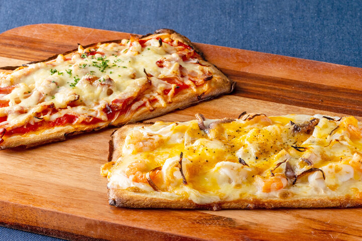 左はベーコン&オニオンのトマトピザ1150円、右はクワトロチーズのシーフードピザ1250円