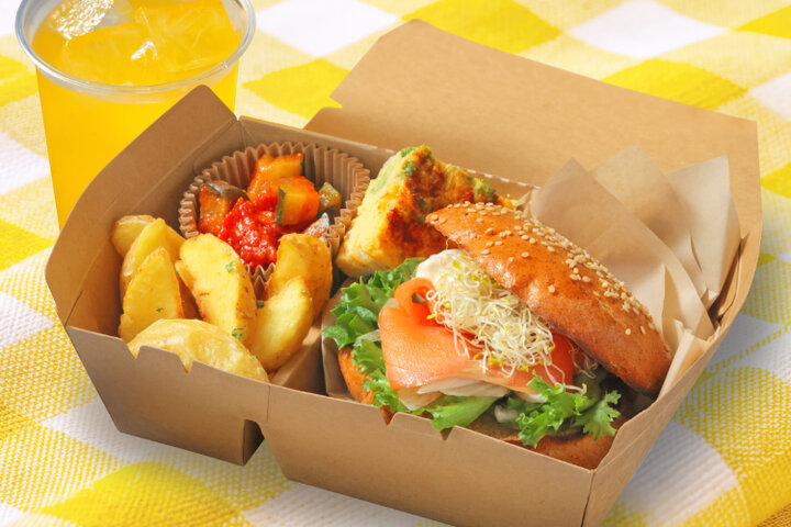 店内メニューだけでなく、店の目の前に広がる芝生で楽しめるピクニックメニューも提供しています。晴れた日は、BOXにサンドイッチやフライドポテト、カポナータ、スパニッシュオムレツを詰め込んだピクニックセットをテイクアウトして、海を眺めながら召し上がれ。レジャーシートもレンタルできますよ。