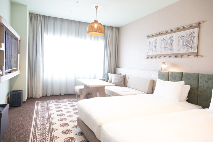 お次は、世界にある4つの海をモチーフにしたスタンダードルームをご紹介。 インド洋がテーマの「インディアンジャスミン」は、淡いグリーンとミルクティー色を基調にした優しい雰囲気の客室。平和や幸せの象徴であるゾウのタペストリーが飾られています。