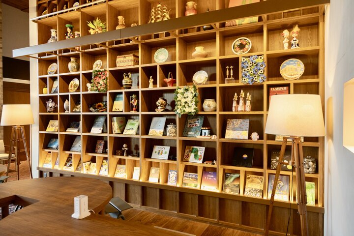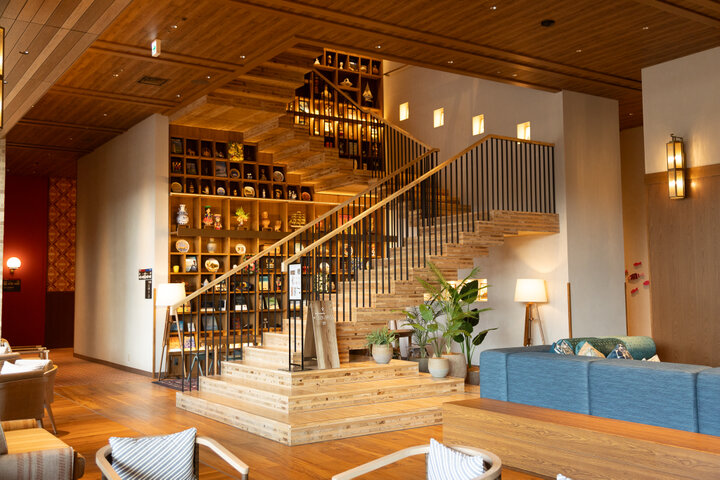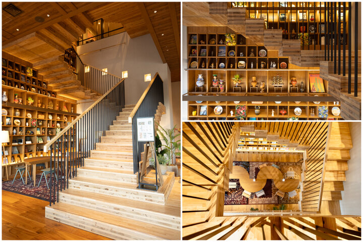 ひときわ目を引くのは、2階レストランへと続く優美な回り階段。かつてこの地にあったという木材市場のレガシーを受け継ぎ、木材を積み木のように組み合わせています。吹き抜けの壁面いっぱいには、旅の思い出を詰め込んだ本棚を設置。さまざまな国のオブジェや人形、プレートなどがディスプレイされていて、階段を登りながらゆっくり眺めることができますよ。