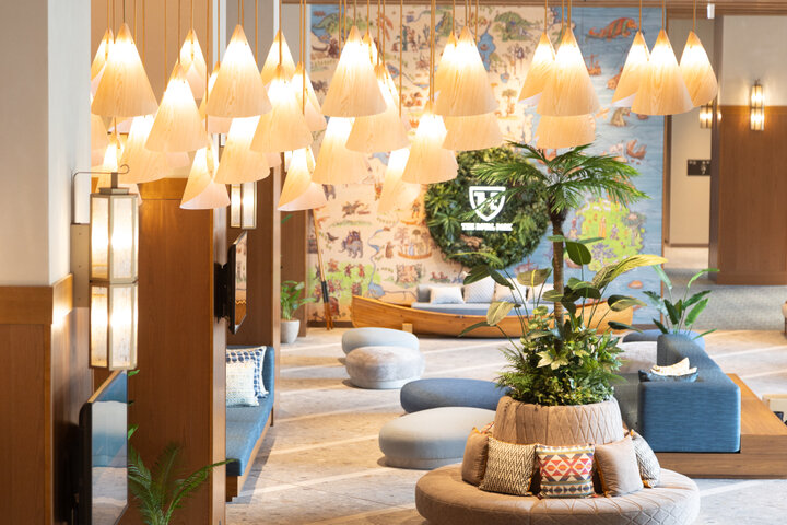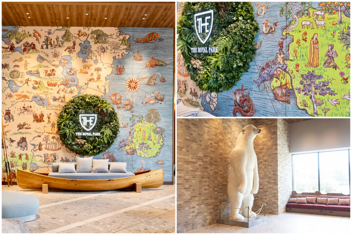ロビーの一角には、中世風のファンタジックな世界地図が描かれた壁画も。謎めいた海の生きものやプリンセスなど、ストーリーを感じられるイラストが随所にあしらわれていて、冒険心がくすぐられます。中央にはホテルのロゴがあり、記念撮影にもぴったり。さらに、その奥にある団体客用のラウンジには、大きなシロクマがどっしりと立っているのでぜひお見逃しなく♪ ソファやイスのデザインも多彩で、どこに腰掛けようか迷ってしまうほど。チェックインを待つ間も、思い思いに過ごすことができます。