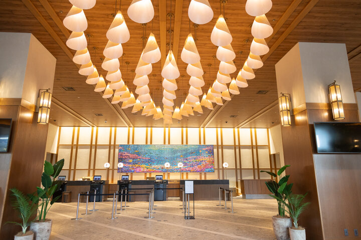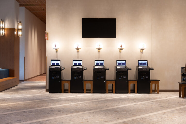 チェックインは、エントランス正面のフロントでどうぞ。自動チェックイン機が11台並んでおり、タッチパネルに入力するだけでスムーズにチェックインできます。混雑時は整理券が配布されるので、それを取ってロビーで待機しましょう。スタッフが24時間常駐しているので、わからないことがあれば尋ねてみてくださいね。もちろん、対面でのチェックインもOKですよ。