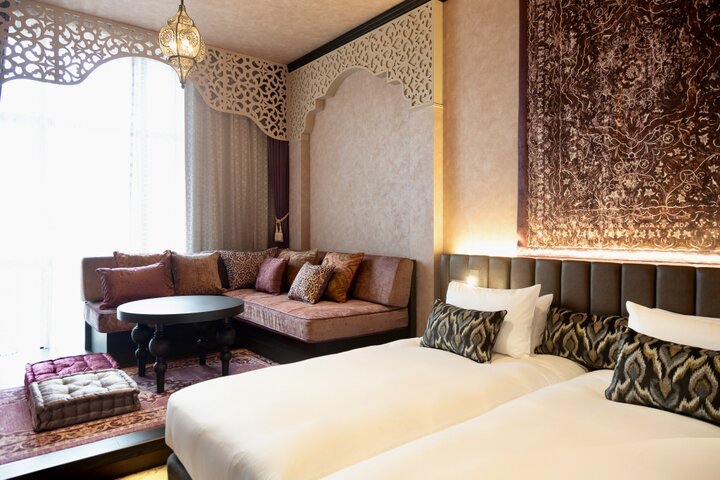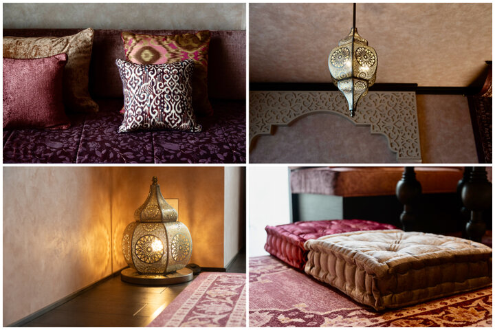 ここからは、気になる客室を見ていきましょう。おすすめは、2階に設けられた3タイプのコンセプトルームです。「アラビアン」は、アラビア風の繊細な文様で彩られた幻想的でエキゾチックな客室。部屋の一角には小上がりの空間があり、ソファやペルシャ絨毯を模したカーペットに座ってくつろぐことができます。 クッションやランプシェードなど、インテリアの細部まで異国情緒たっぷり。アラビアンナイトの物語に迷い込んだ気分で、ロマンチックな夢が見られます。