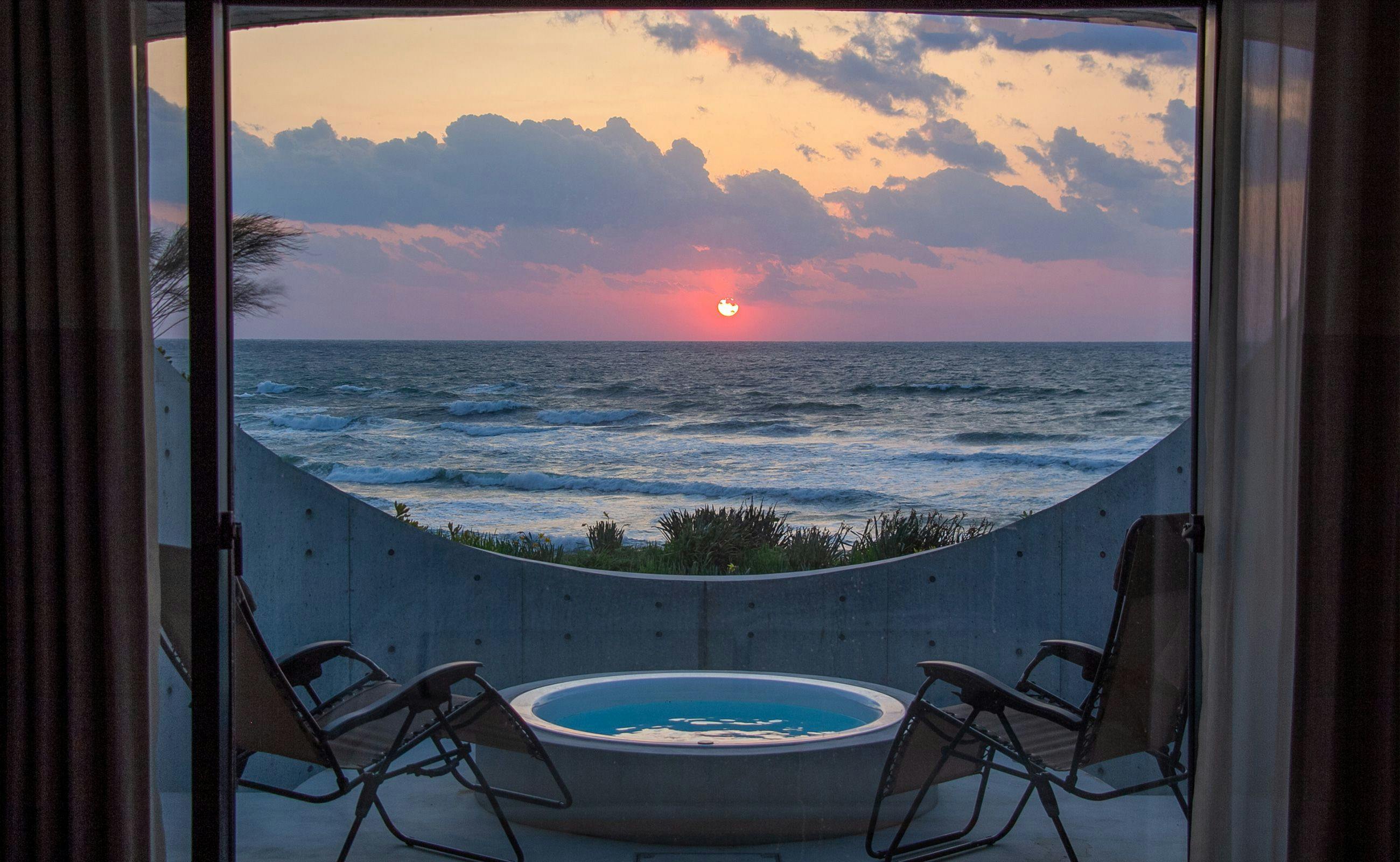 出雲の西海岸に面した崖の中に作られ、まるで洞窟の中のような非日常の客室。砂浜から約10mの断崖の中につくられた客室は、最良の風景を楽しむために、それぞれ異なる方向に向いて設計された全室オーシャンビュー。雄大なサンセットを心ゆくまで楽しむためにジャグジー付きの広々としたテラスを配し、空と海、雄大な夕日を静かに見つめながら時間を刻む、特別な滞在を提供しています。