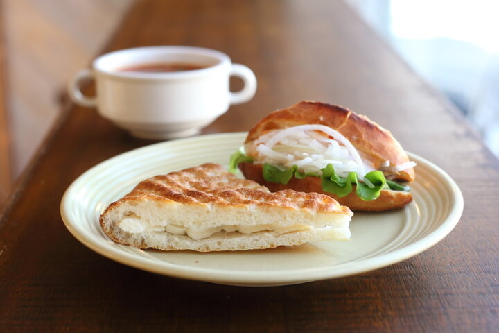 お店の名物&一番人気は、しっとり焼き上げた鯖フィレに特製唐辛子マヨネーズ、たっぷりのスライスオニオンなどの野菜をはさんだ「サバサンド」。フランスパン生地で作ったザクっと食感のよいパンに具材をはさんだ、ボリュームも大満足のカスクートサンドです。カスクートサンドは、ほかにも海老アボカド、キャロットラペとチキンなどいろいろな種類があり、それだけでランチにもなるほど贅沢に具材が入っていますよ。