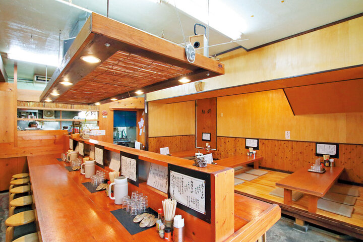 かつて首里にあった名店の技を受け継ぐ手打ちそばの有名店。店内はフローリングでモダンな雰囲気。小麦粉100%でもちもちとした手打ち麺と、豚肉とかつおだしがベースの透明スープはツウもうなる味です。