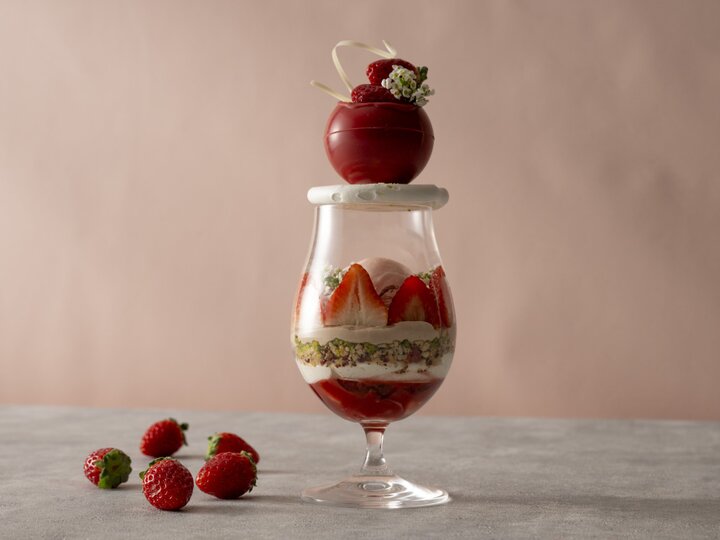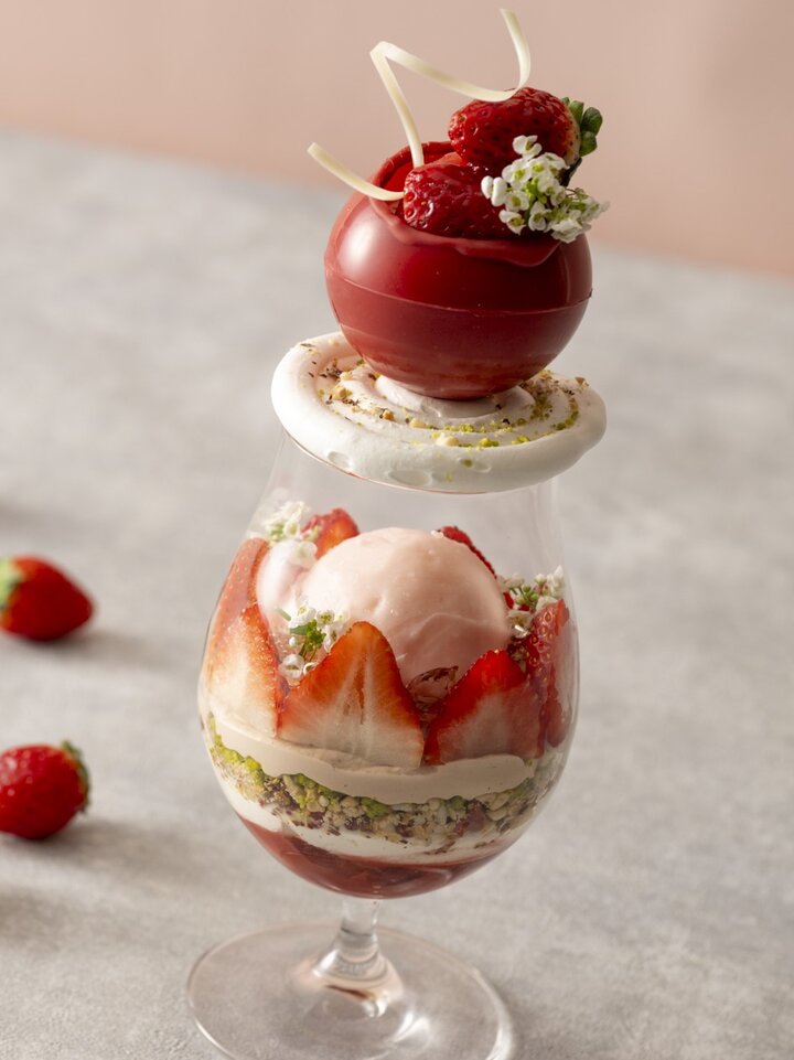 ヨコハマ グランド インターコンチネンタル ホテルでは、横浜の海を望むラウンジ&バー「マリンブルー」にて、ライチ酒の芳醇な香りが広がる大人のためのいちごパフェ「パルフェ フレーズ~いちごのパフェ~」を、2026年2月16日~5月10日の期間提供します。 グラスの上には優しい甘さのメレンゲで作ったプレート、さらにその上にはいちご風味のチョコレートで仕立てた、朱色が美しいチョコレートの球体を飾りました。球体の中には、いちごの甘酸っぱさをまろやかに包み込むマスカルポーネチーズとレモンのシャンティを忍ばせ、上からフレッシュないちごが顔をのぞかせる、愛らしい仕立てになっています。 グラスの中央には、フレッシュな甘酸っぱさを楽しめるいちごのアイスクリームに、いちごと相性の良いまろやかなミルクチョコレートガナッシュ、ドライストロベリーやピスタチオ、アーモンドなどを重ね、食感のハーモニーを楽しむことができます。