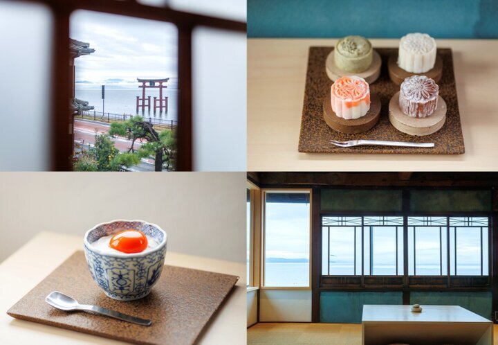 滋賀の高島に鎮座する白鬚(しらひげ)神社は、2000年以上にわたり旅人の安全を見守ってきた近江最古のお社。まるでびわ湖に浮かんでいるかのような湖中の鳥居がシンボルです。境内から南に歩いてすぐの場所には、2階から白鬚神社の鳥居が望めるカフェ「白鬚喫茶」があります。刻一刻と表情を変えるびわ湖ブルーを眺めながら、餅米、卵、お茶など、地元高島や滋賀県産が中心の素材を使ったメニューが楽しめますよ。