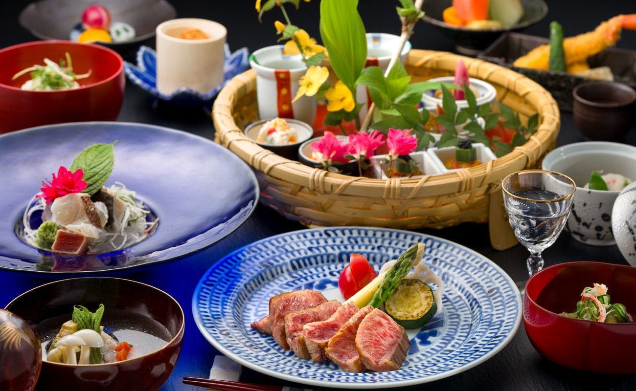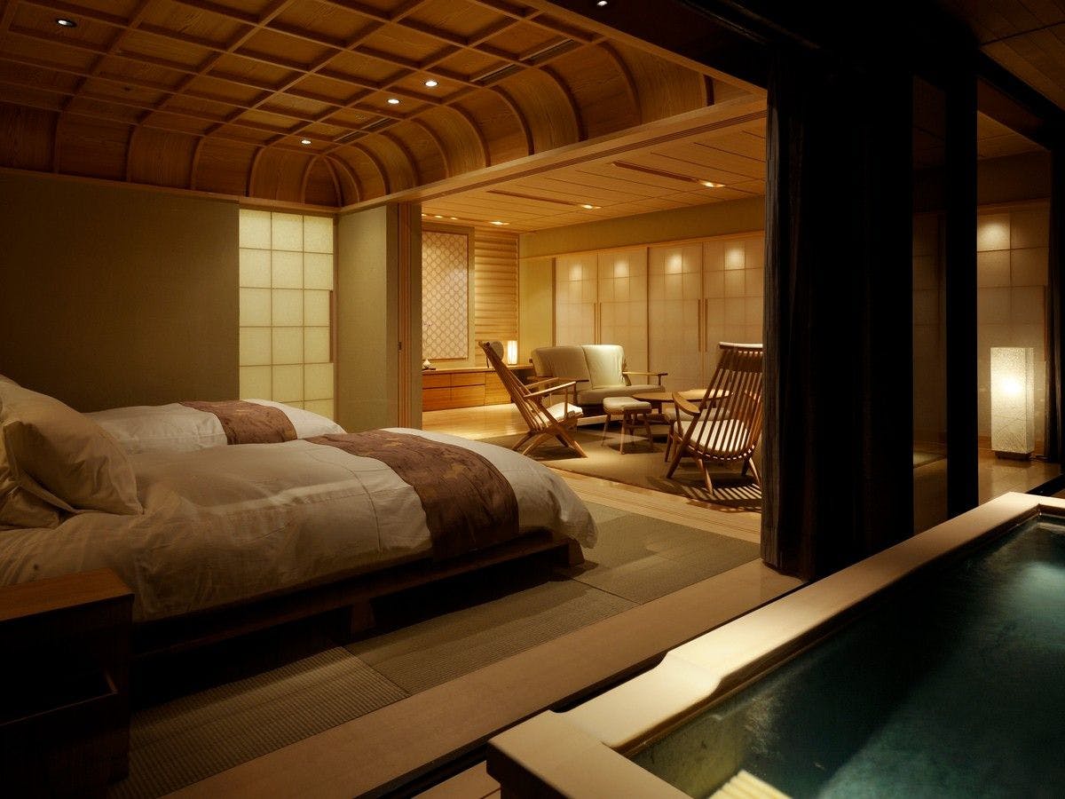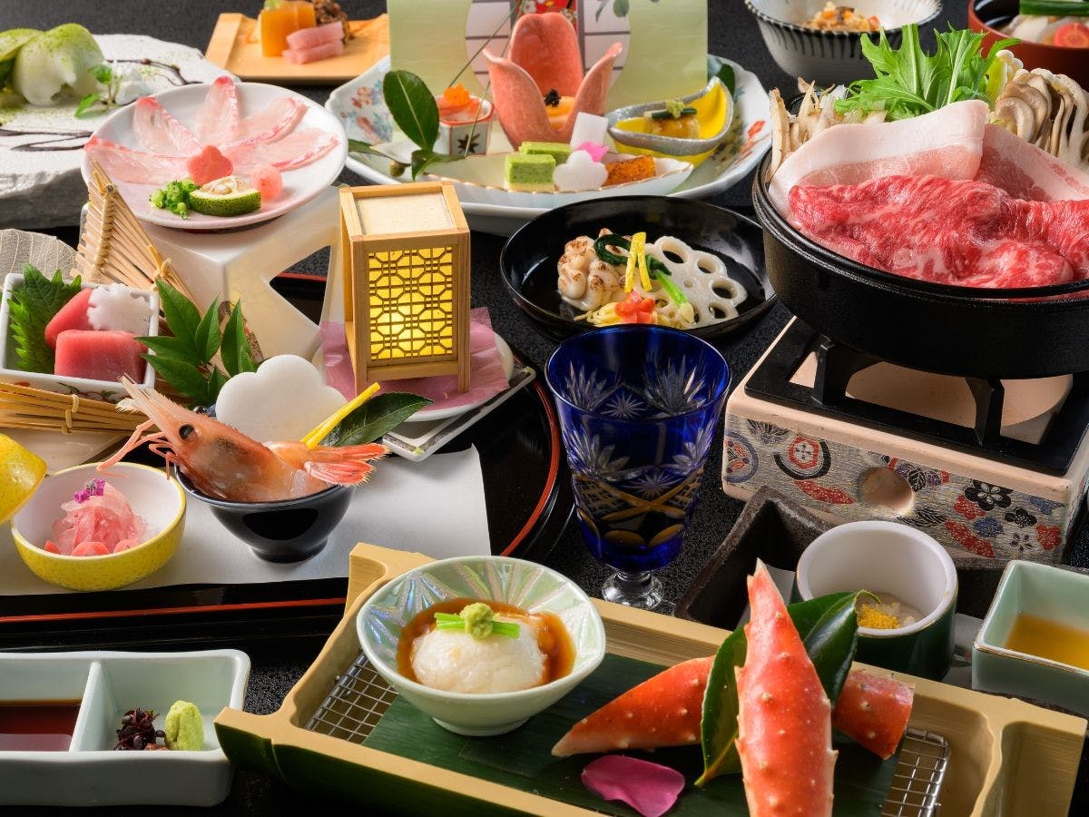 客室はすべてゆとりの造り。贅を尽くしたスイート、露天風呂付き客室など、どの部屋も、“日常の続きを泊まる”のではなく、非日常に浸るための空間です。食事は、四季と地元の恵みを活かした会席料理。グランシェフがひと皿ひと皿に心を込める、五感に届く美味を堪能することができます。