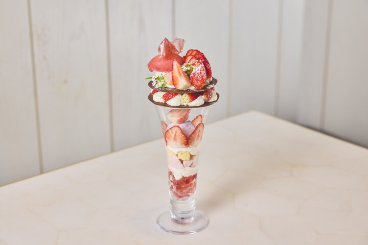 いろんな種類のいちごスイーツを重ねた、いちご尽くしの華やかなパフェです。