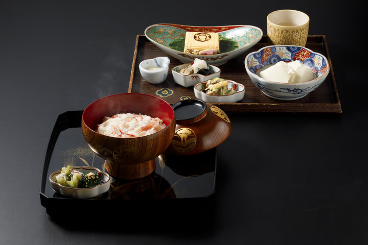 完全予約制の朝食「かに粥」は、あおさを使用したあん添えの出汁巻き卵に、季節の小鉢、自家製豆腐など、職人の技と心が込められたお膳から始まります。そして土鍋で炊かれた「かに粥」が登場し、あつあつとろりとしたお粥を器によそい分け、目の前へ。カニの旨味を凝縮した朝の一椀は、香りもご馳走です。