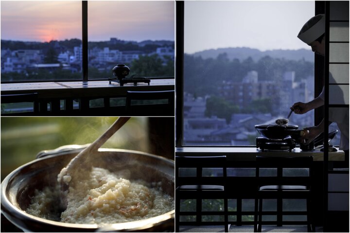 (左上・右)会場は2階。金沢の美しい街並みを一望できる部屋で特別な朝食を(左下)古くから伝わる、かに粥