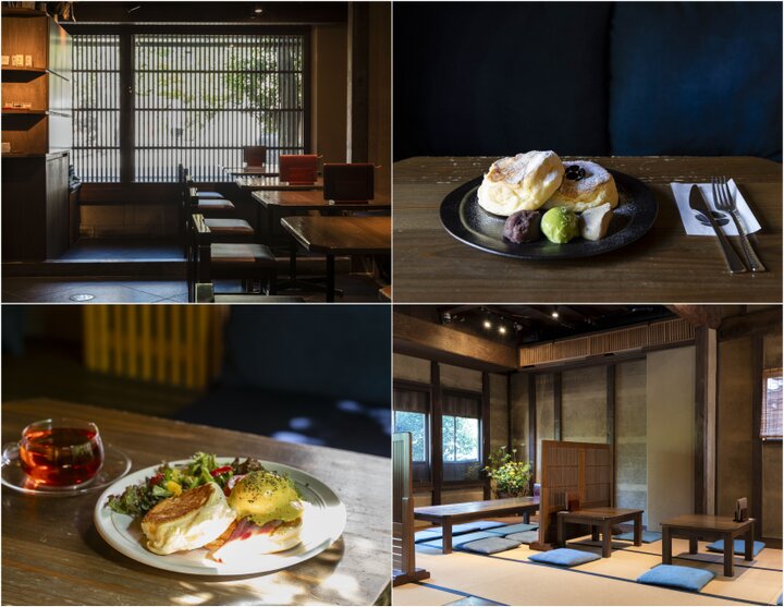(左上)格子を通して光が入り込む美しい光景 (右上)能登大納言あずきの米粉パンケーキ1700円(右下)2階の座敷席(左下)朝8時~10時までの限定メニュー「朝たもん」から、エッグベネディクトパンケーキ1900円